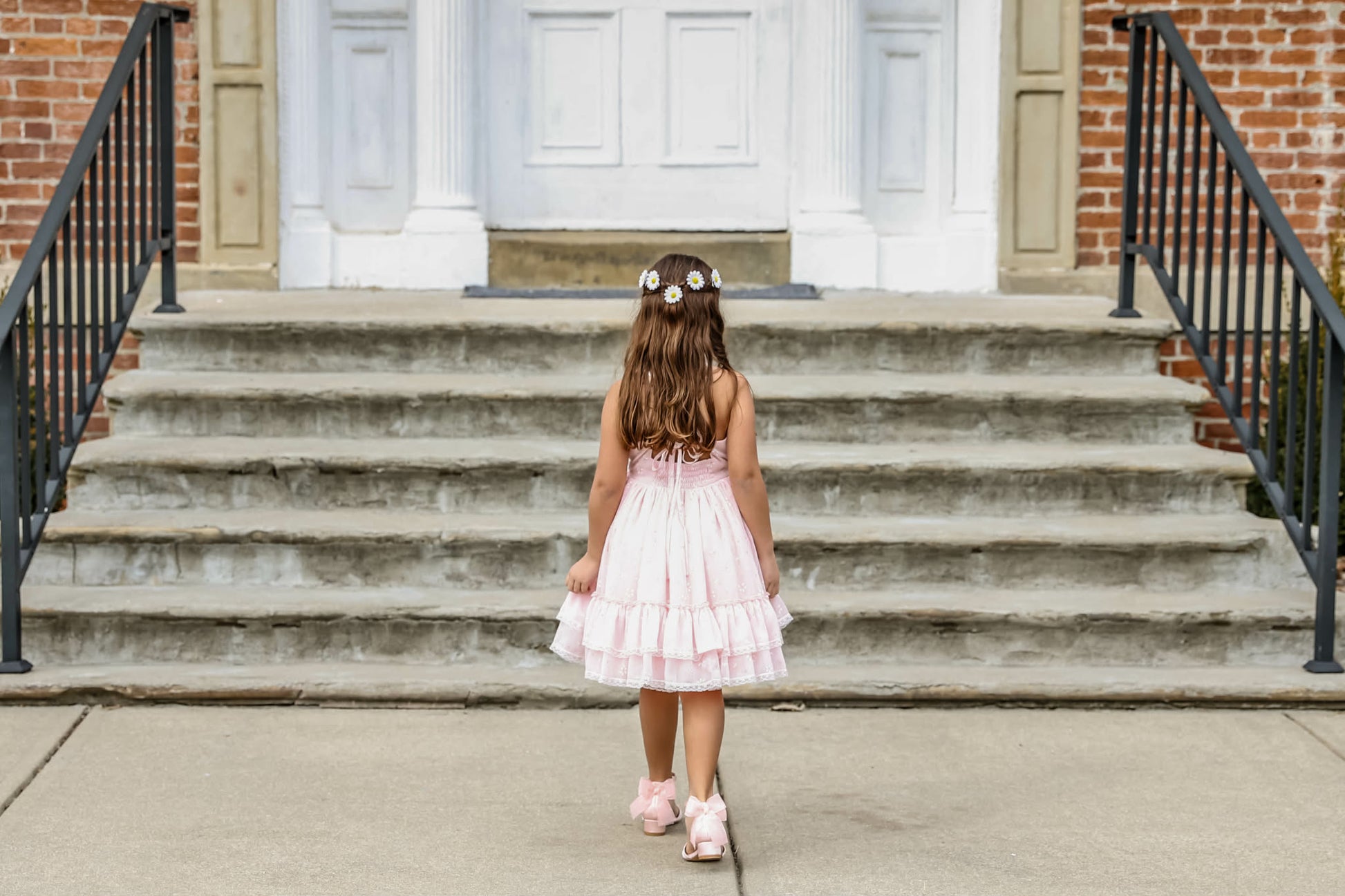 Almond Blossom Dress: Made of chiffon fabric. This dress has no petticoat. Elastic on the back, adjustable straps. Bloomers included. Other accessories shown on images are not included.