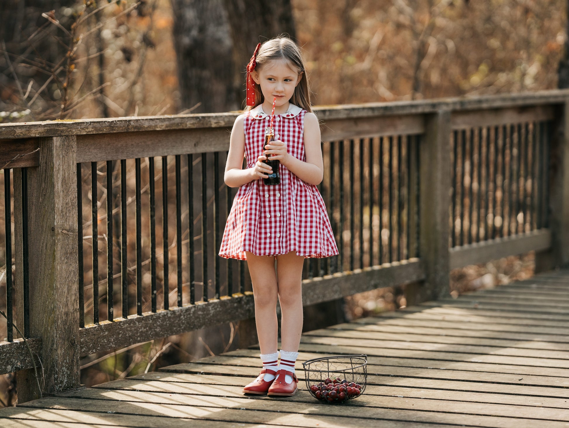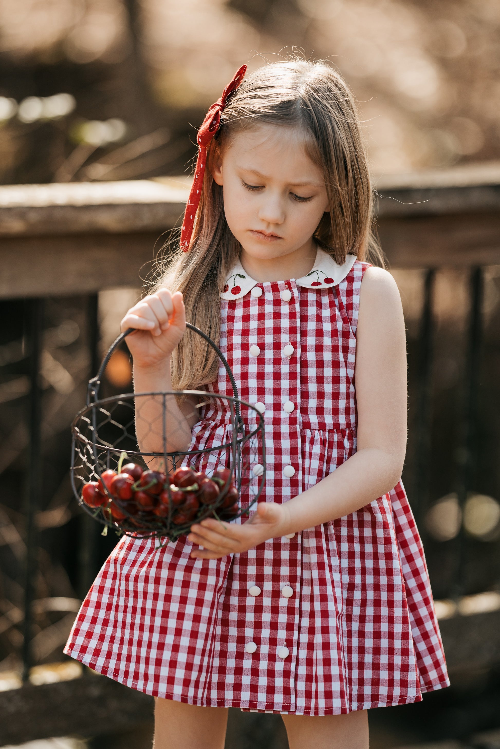 Cherry Dress: Made of cotton gingham, machine embroidery on the collar, pockets on the side of the skirt, and sash on the back. Bloomers included.