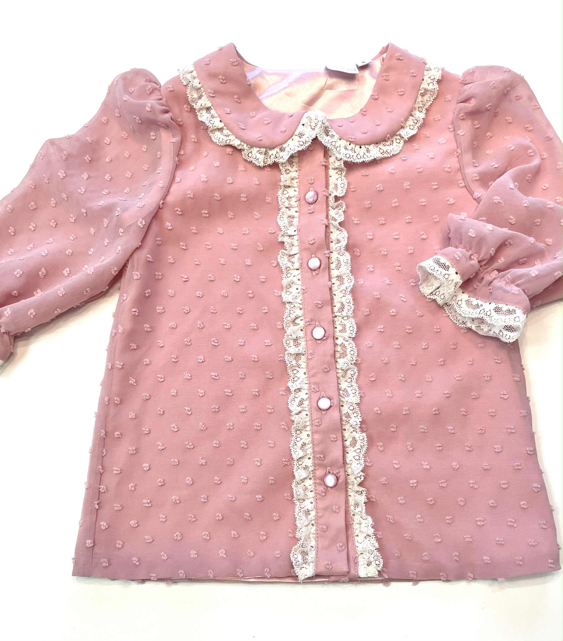 Cookies Cottage Blouse: Made of Swiss dot chiffon fabric. Lined with cotton fabric. The sleeves are 3/4 length.
