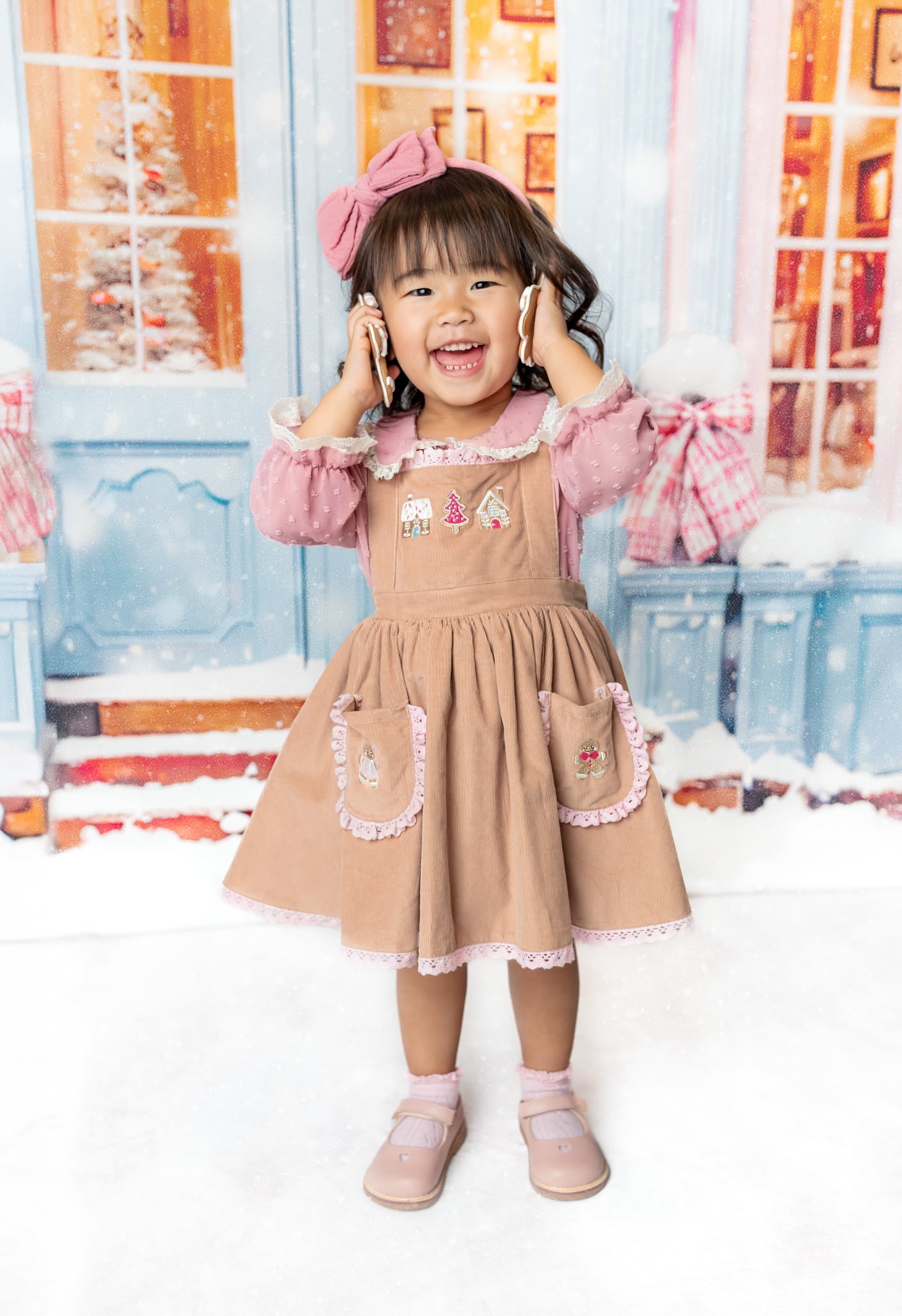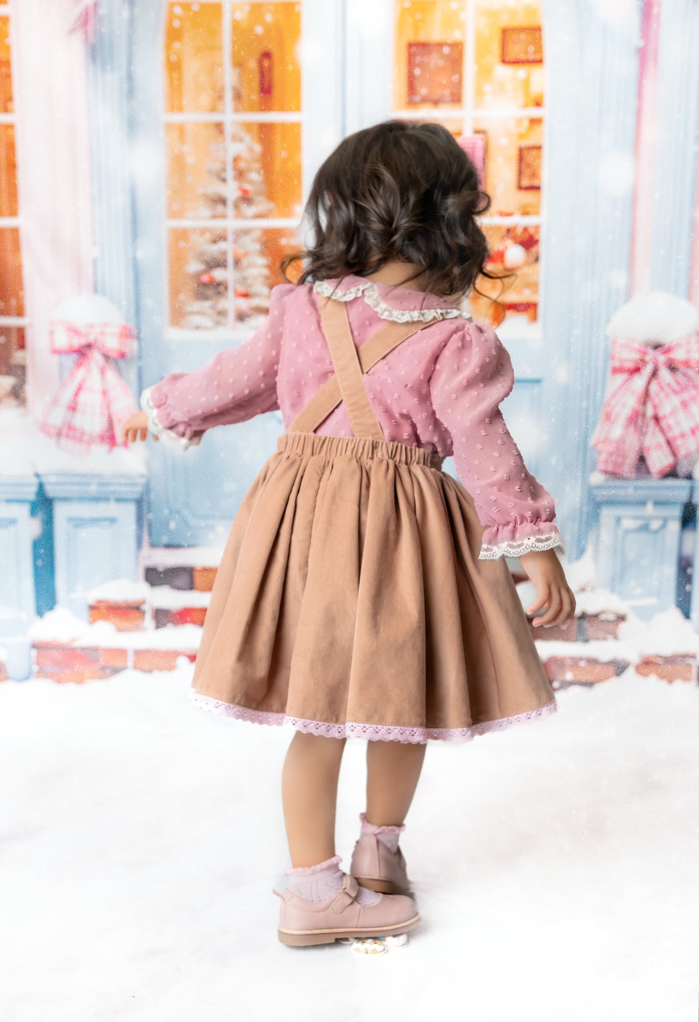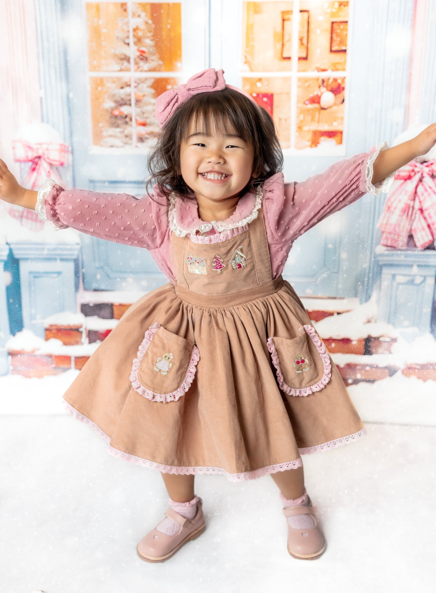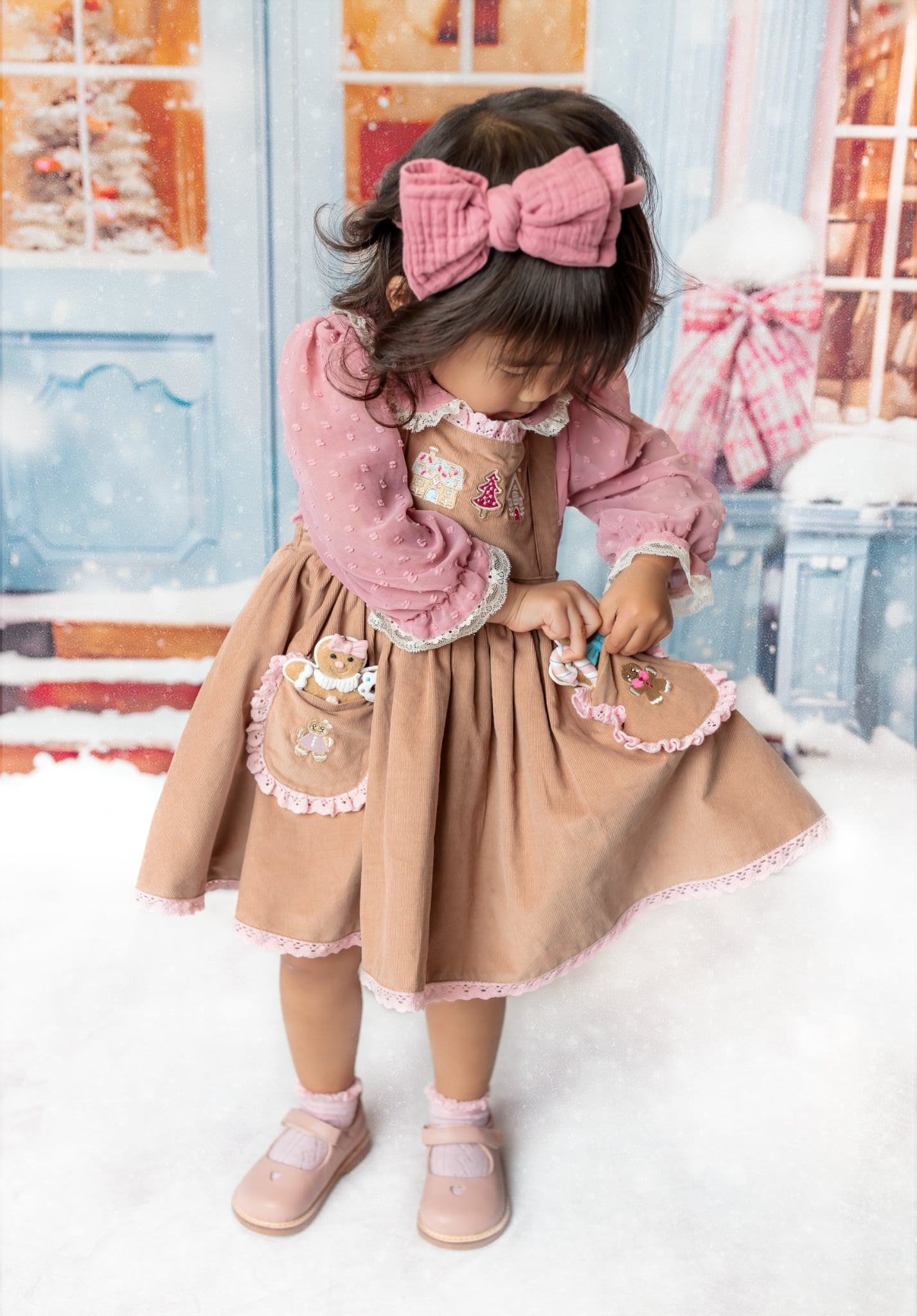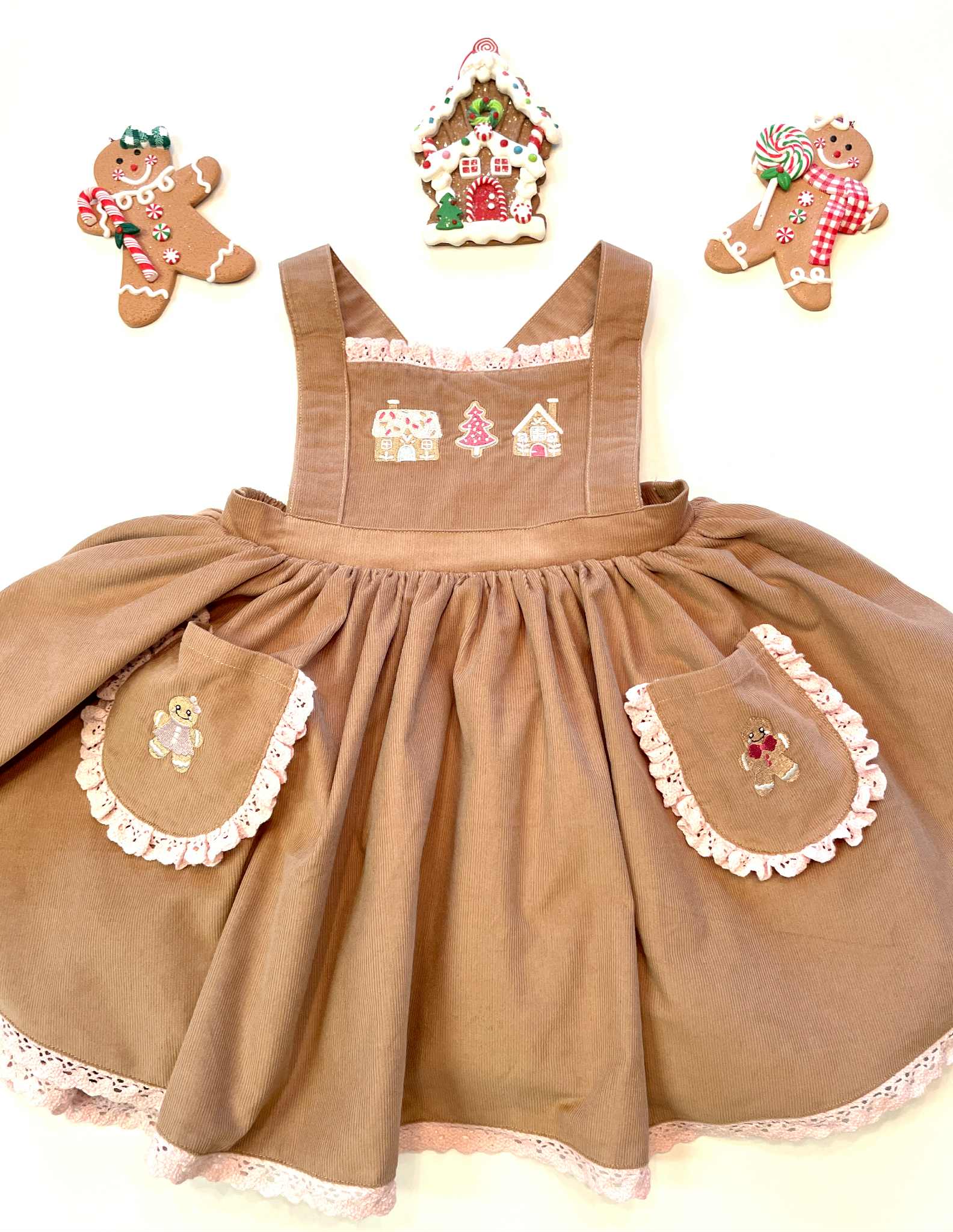 Cookies Cottage Pinafore: Made of fine corduroy, soft fabric. Machine embroidery on the bodice and pockets. Adjustable shoulder straps. Bloomers are included.