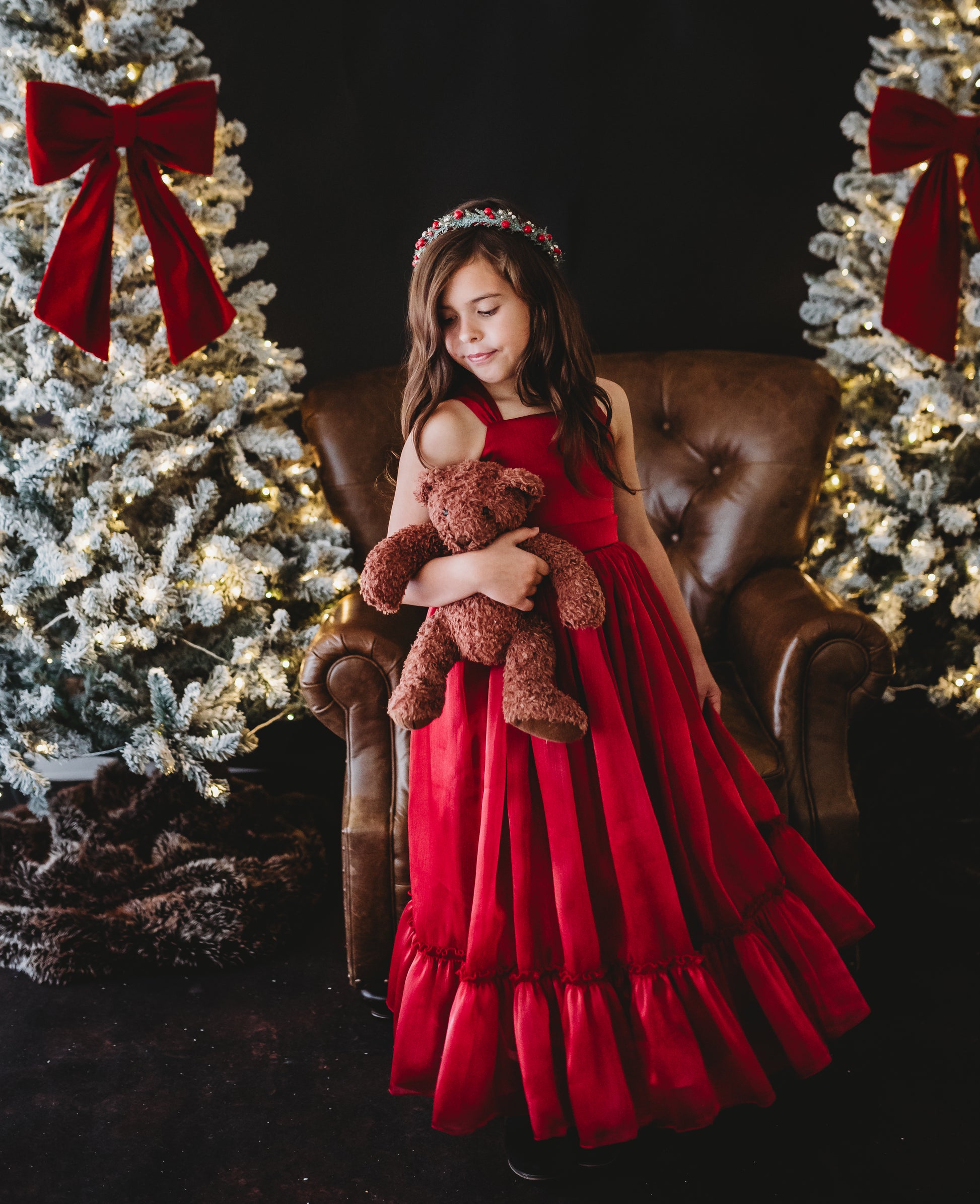 Cranberry Delight: Christmas Dress made of light, airy chiffon that has a soft, flowing texture. The dress has fitted bodice and full skirt that allows for movement and comfort. Perfect blend of elegance and festive charm. It's perfect ensemble for a Christmas party, holiday photoshoot and Christmas Eve gathering.